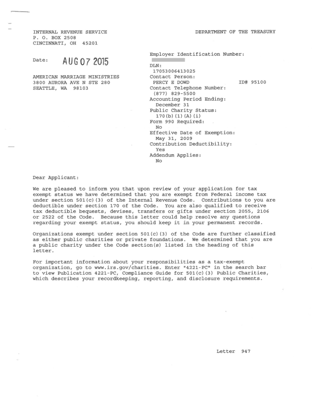 American Marriage Ministries was recognized by the IRS as a 501c3 Non-Profit Charity as of August 7th of 2015.