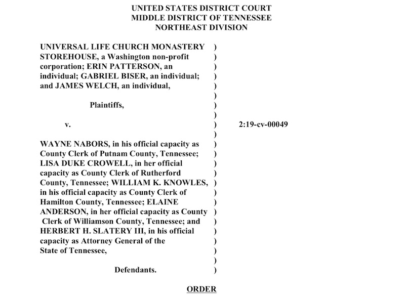 A July 3rd Ruling By Tennessee District Court Judge Waverly Crenshaw ordering that the STATUS QUO (Legally Accepted Online Ordination) SHALL BE MAINTAINED and this SHALL CONTINUE until the Court issues a ruling after the trial. This Document ensures that online ordained ministers may still perform legally valid weddings in the state of Tennessee until resolution of the legal challenges to the law.