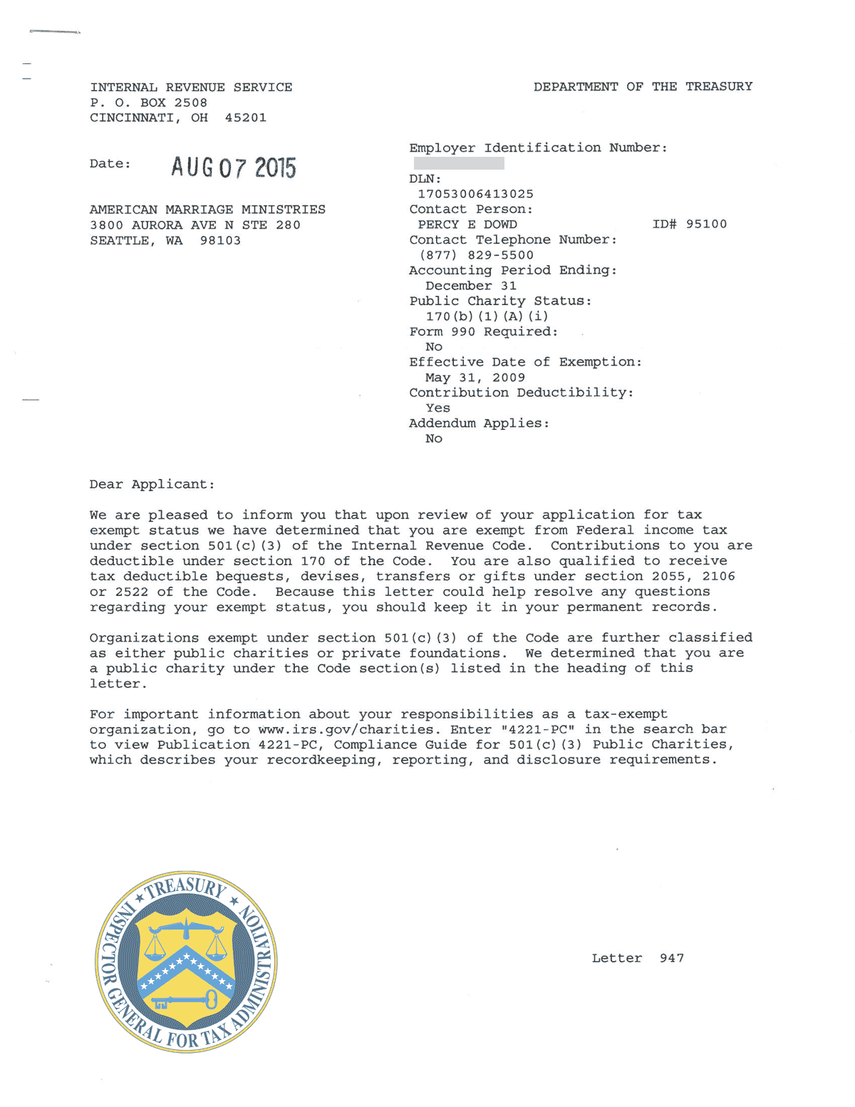 American Marriage Ministries was recognized by the IRS as a 501c3 Non-Profit Charity as of August 7th of 2015.