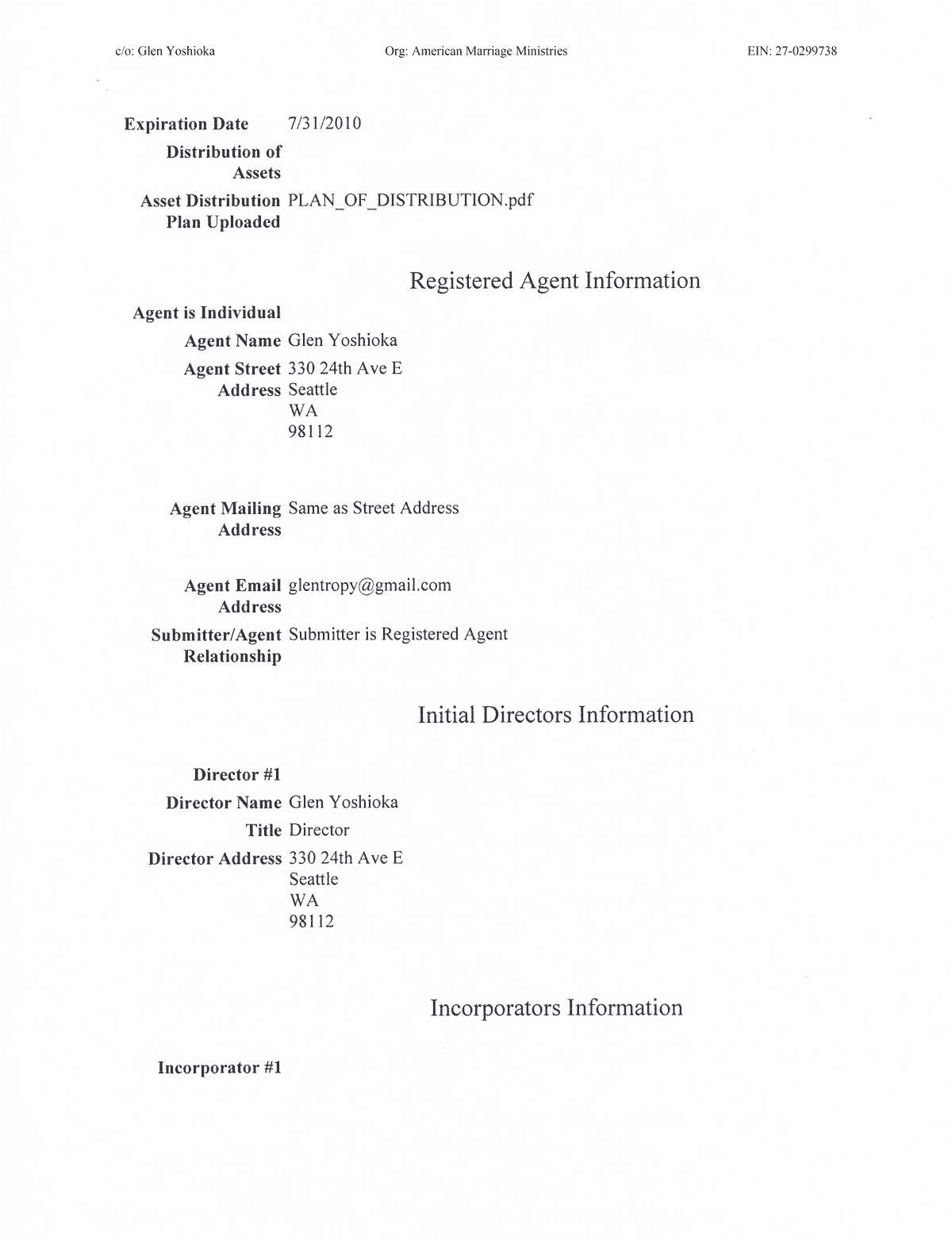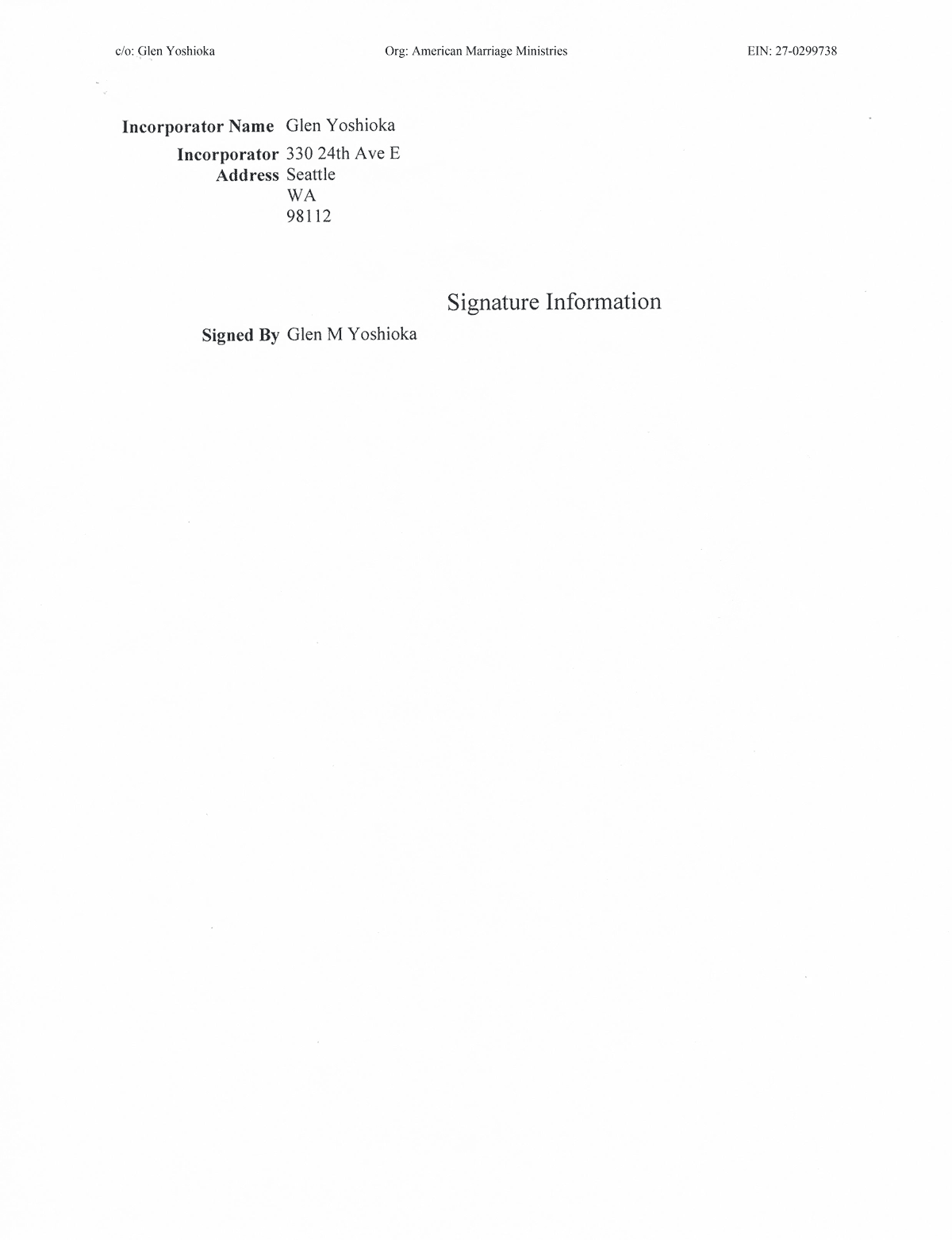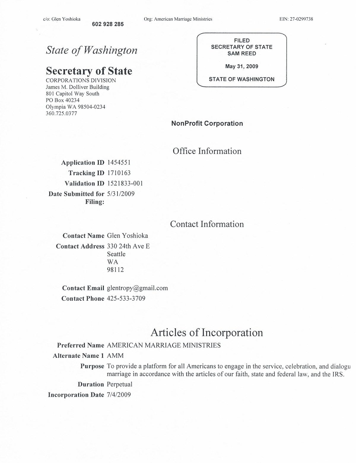 American Marriage Ministries was Incorporated on July 4th of 2009 in Washington State. The AMM Purpose is to provide a platform for all Americans to engage in the service, celebration, and dialogue of marriage.