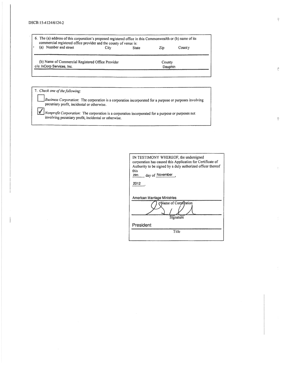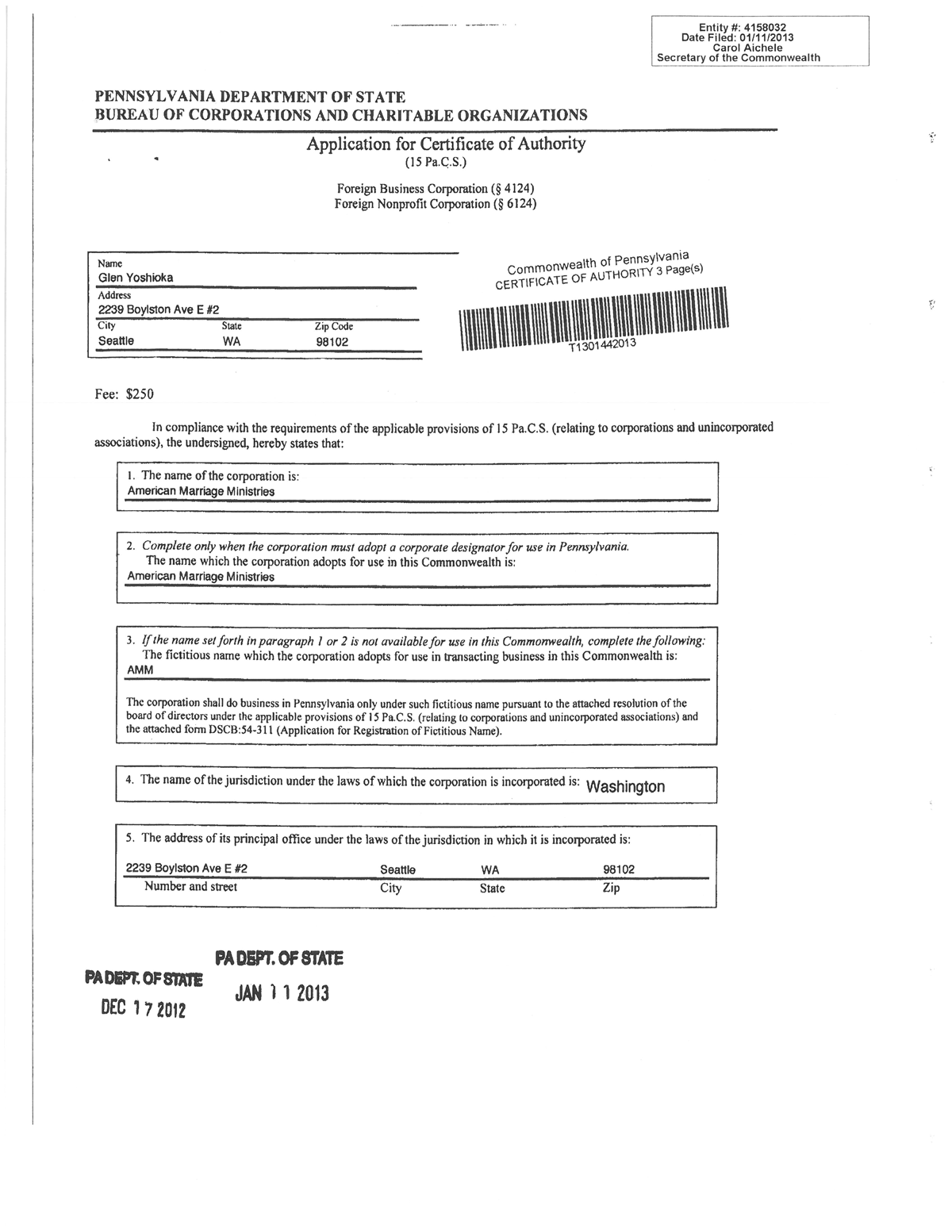 American Marriage Ministries Foreign Corporation Certificate in Pennsylvania. AMM was incorporated in Pennsylvania on January 11th of 2013.