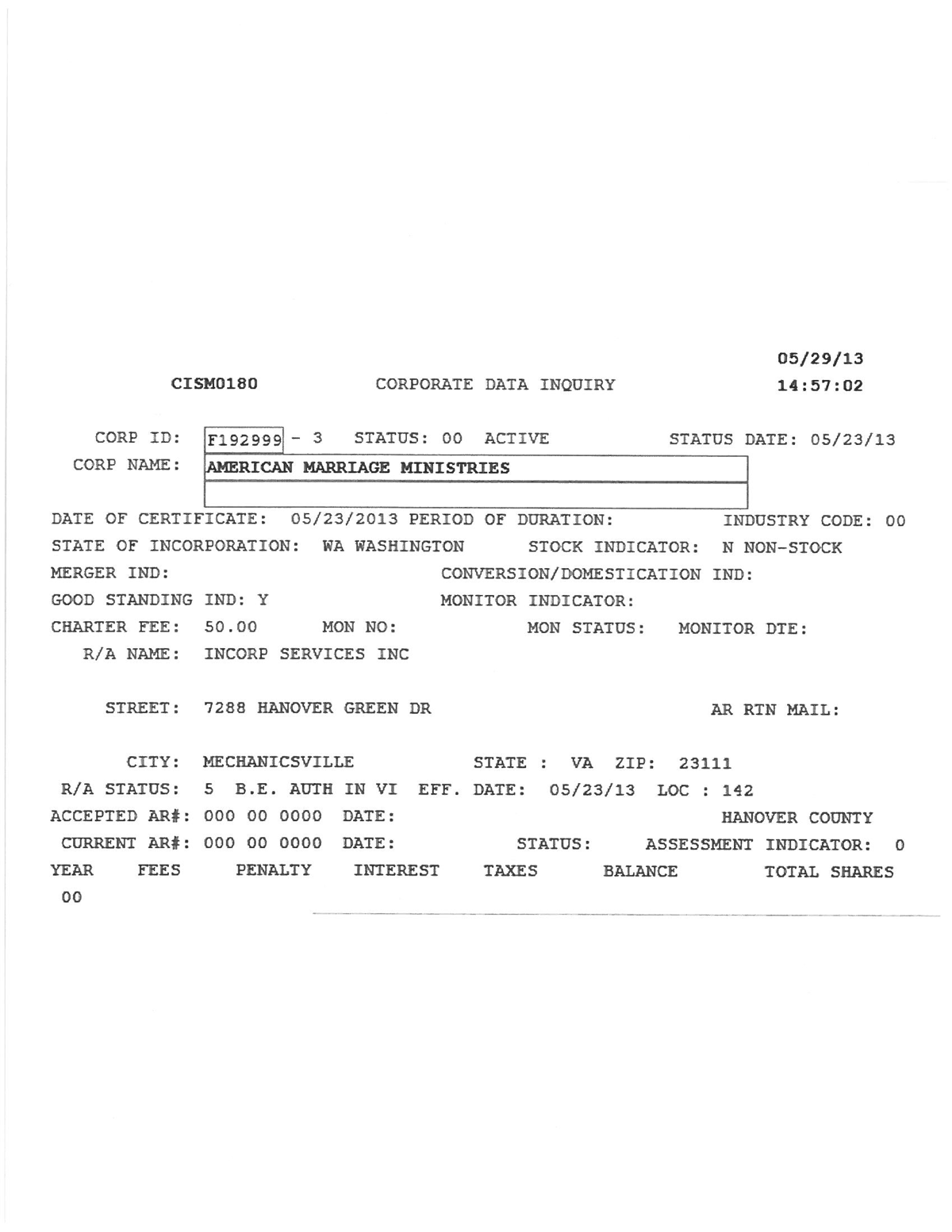 American Marriage Ministries Foreign Corporation Certificate in Virginia. AMM was incorporated in Pennsylvania on May 23rd of 2013.