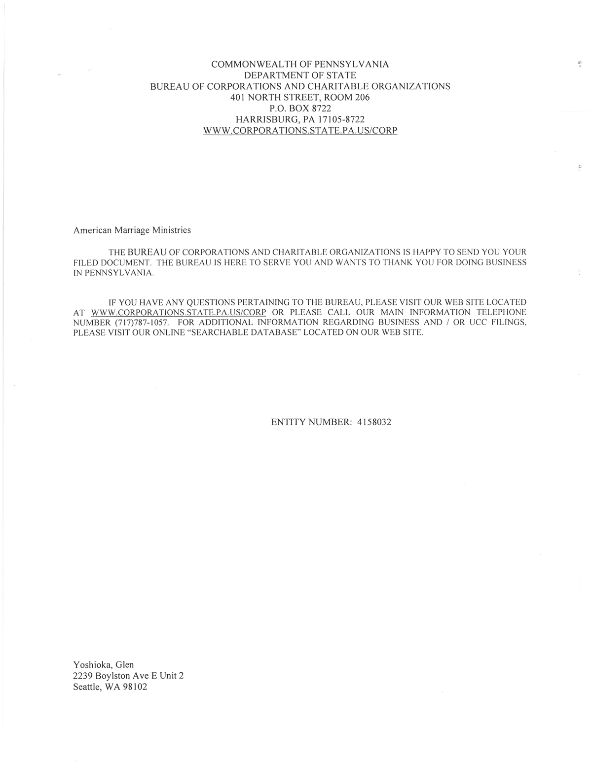 American Marriage Ministries Foreign Corporation Certificate in Pennsylvania. AMM was incorporated in Pennsylvania on January 11th of 2013.