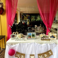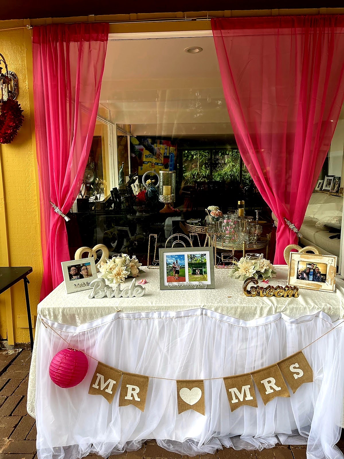 "What a great couple and caring parents who wanted the best for the couple. They wanted the ceremony fairly basic with little frills. We couldn't help ourself, but to decorate the place as much as possible and give them things they did not pay for. They had a cute story about how they met....Jacob was attending a birthday party with a friend at the Green Pig Bar. His buddy was friends with Daisy's sister and she was extended the invite as well. Jacob took one look at Daisy and thought to himself...wow, she is pretty gorgeous. They started chatting, and later in the evening he told her..."I'm going to ask you out for a date".... This meet almost didn't happen. Daisy's sister invited her a week before the event; however, the day of the party, she felt a little "tired", and she had to be talked into going....afterwards she was surely glad she did. Their first date was to a movie theater. Daisy thought it was awesome that Jacob held her hand, and they both felt an instant connection. Feelings continued to grow for Jacob and he knew she was the one when they were both eating out of wine glasses - Jacob was eating cereal with milk and Daisy was eating flaming hot cheetos w/ chopsticks. Jacob finally got the courage to propose marriage, so he took Daisy to the Museum of Natural History at the University of Utah, where they had their second date. Throughout the date he was waiting for just the right location to propose marriage. The museum had a special exhibit in the Planitarium, and Jacob knew that this was it. There was no one around, so under the stars, moon, and the universe overhead, he proposed marriage on the spot. The weather was iffee for the ceremony and reception (outdoor). Winds were forecasted to be 20-30 knots and 30% chance of rain. The wind actually felt great and didn't affect the decorations much. It didn't rain during the ceremony, but it did a little bit during the reception. All in all everyone was very appreciative and had a great time."
