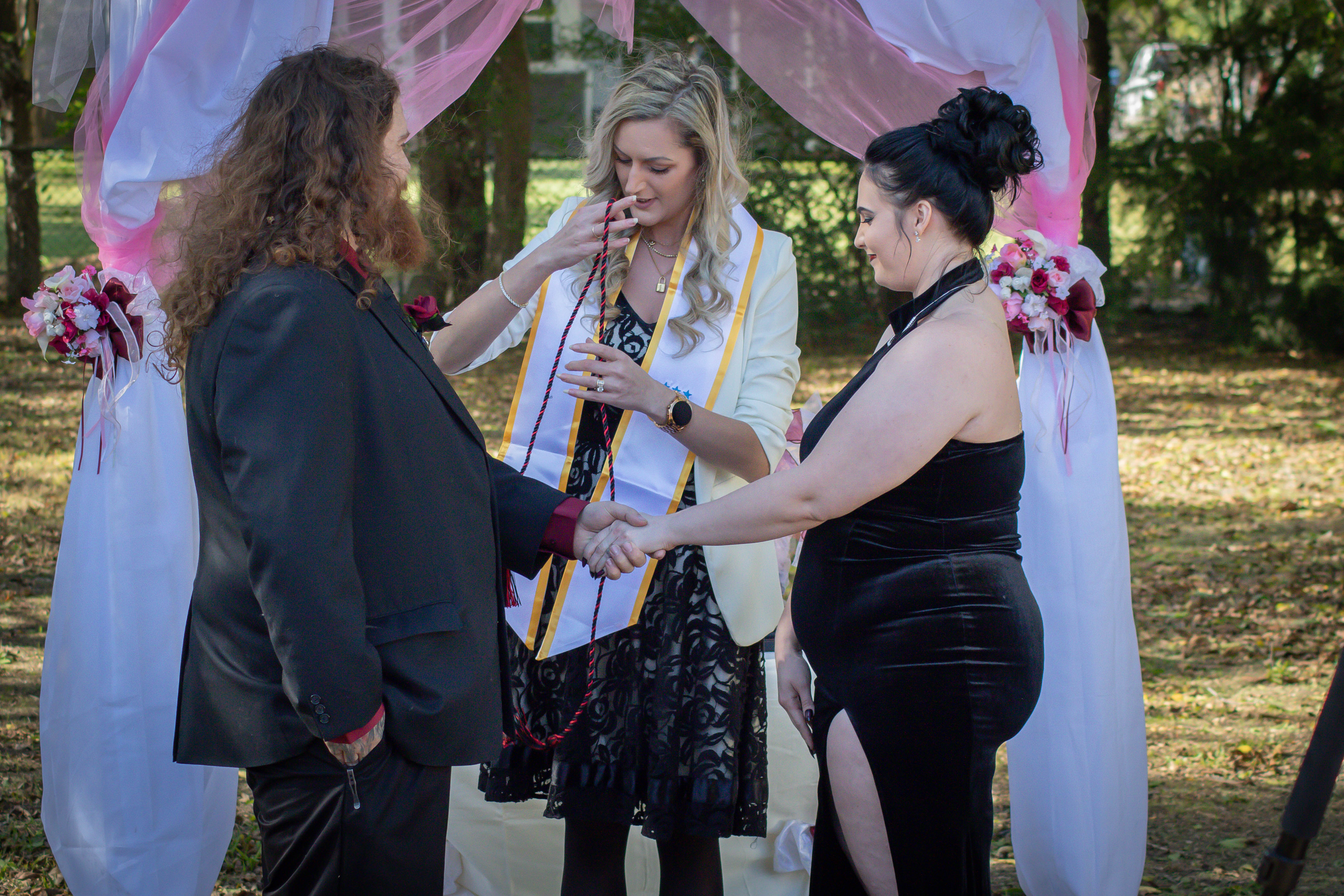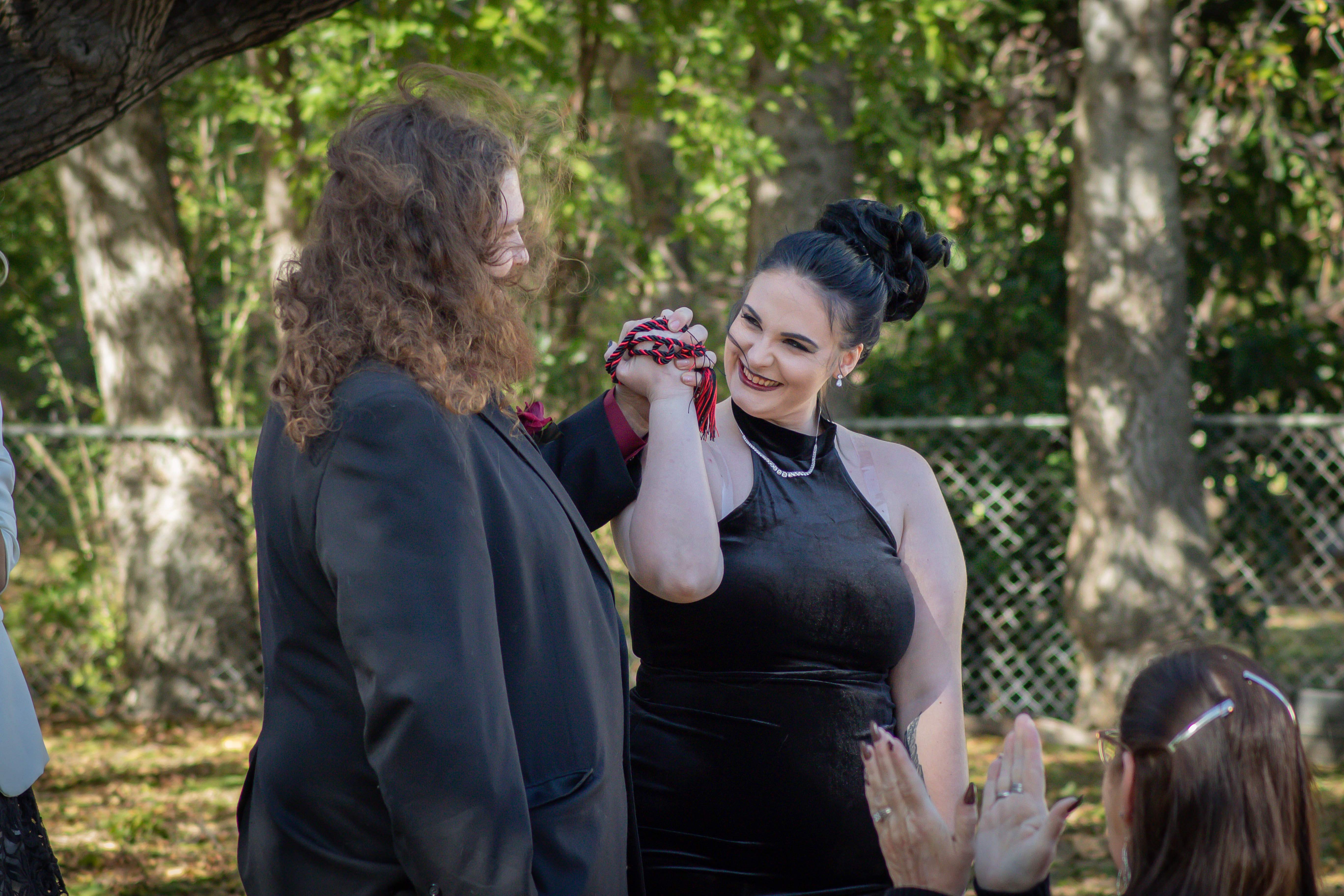 TO THE RECEPTION: “As part of their wedding ceremony today, Slater and Bree have asked us to join them in a handfasting ritual to symbolize that their union takes place on a spiritual as well as a physical level. Handfasting or hand tying dates back to ancient Celtic times. It was once the traditional form of marriage and it is the original source of the expression to “tie the knot”. The cord tied around their joined hand symbolizes the joining of their two lives together and also the joining of their two families.“