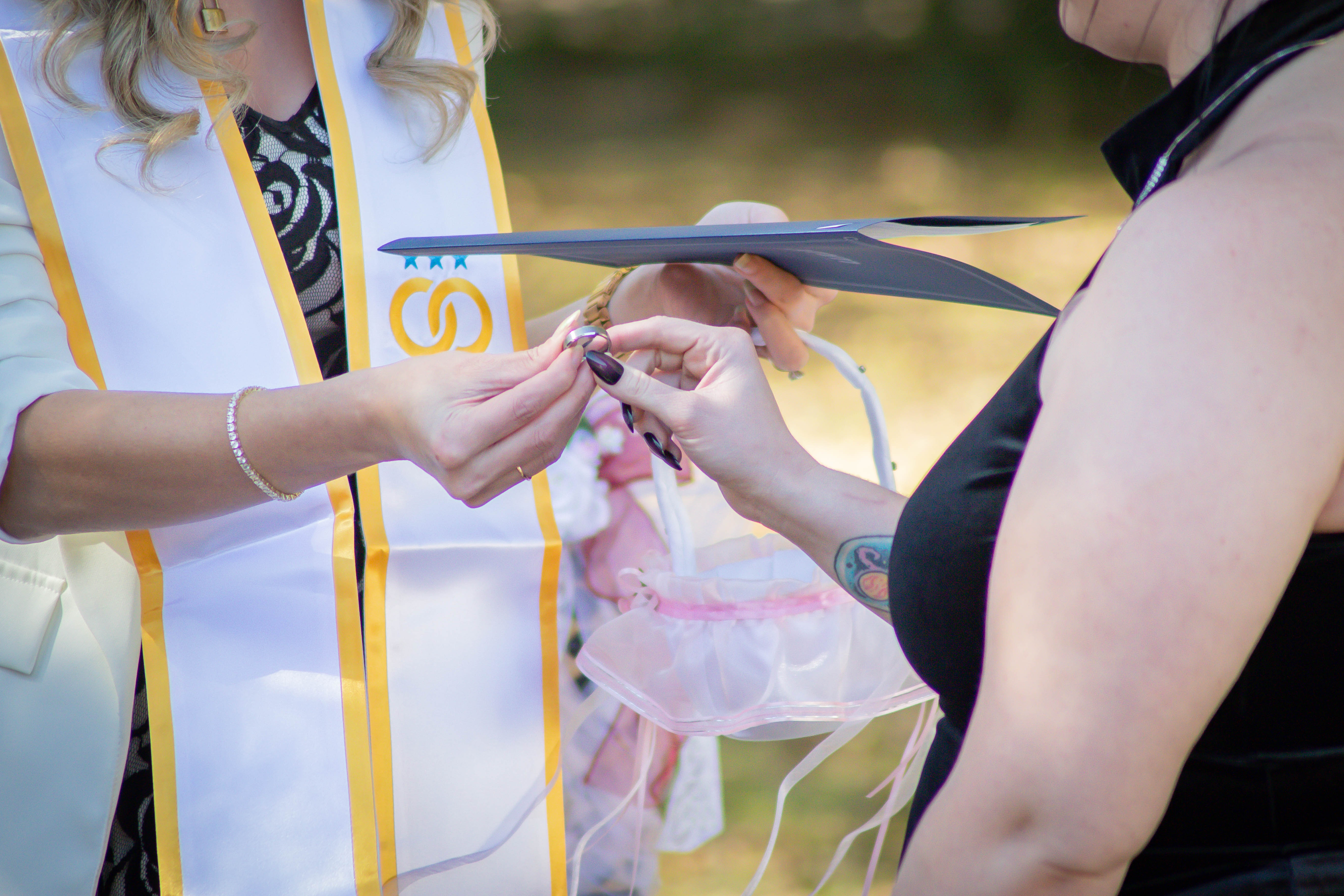"And so now, by the power vested in me by American Marriage Ministries, it is my greatest honor to pronounce you Husband and Wife. You may kiss the bride."