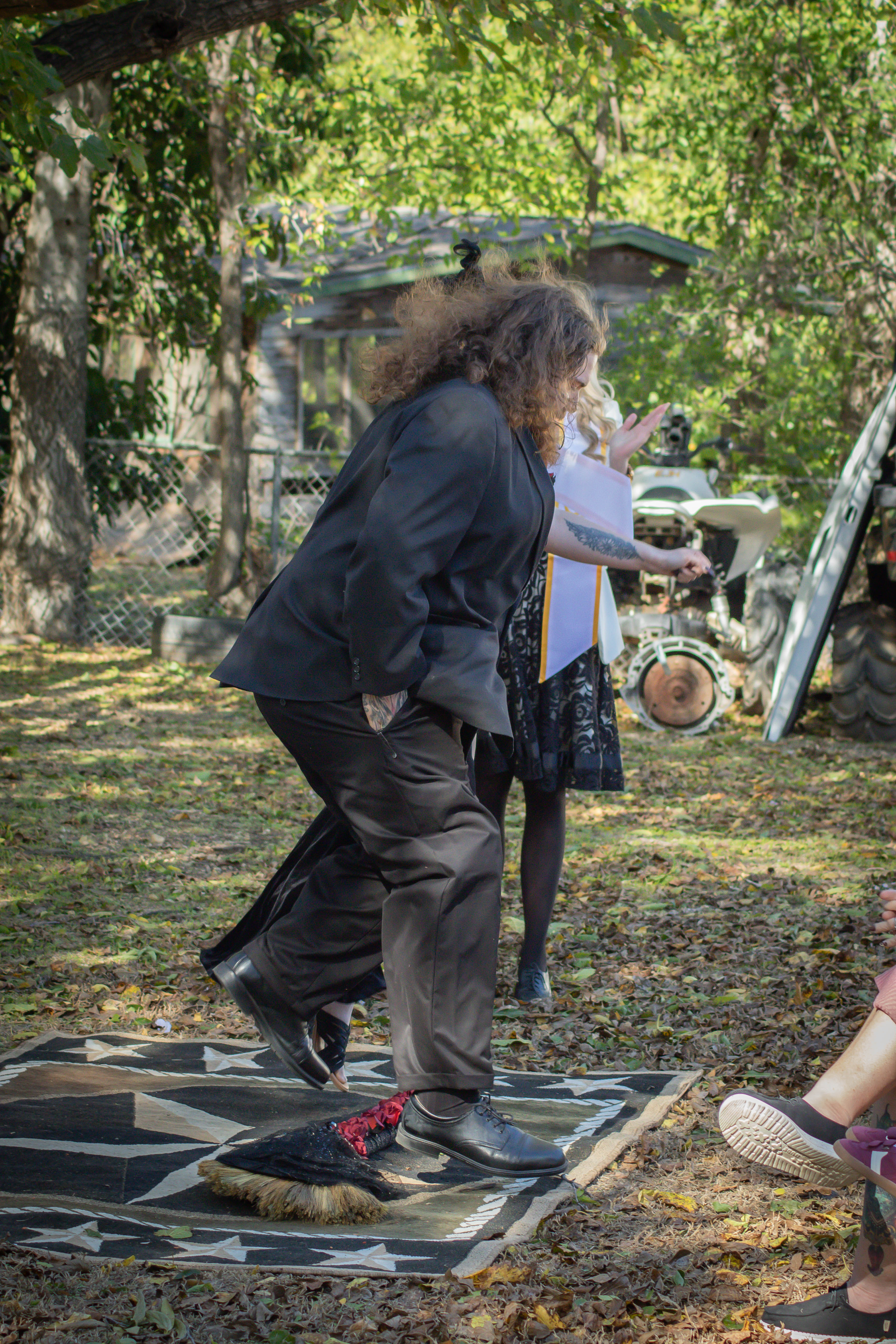 TO THE RECEPTION: "Lastly, as our bride and groom physically and spiritually cross the threshold to matrimony, let's witness the ceremony of jumping of the broom. It marks the beginning of making a home together. The broomstick itself represents the almighty hand of God, and the bristles represent the community. It symbolizes swiping away the old and welcoming the new."